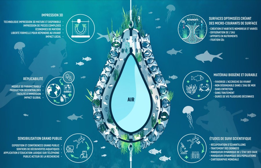 Le projet développe une bouée-récif flottante entre deux eaux, biogénique et éco-conçue, fabriquée à partir de biopolymères imprimés en 3D et de matériaux de réemploi. Sa structure multiple offre des surfaces d’accroche pour la flore et la faune locales, créant un refuge pour les espèces végétales et animales.