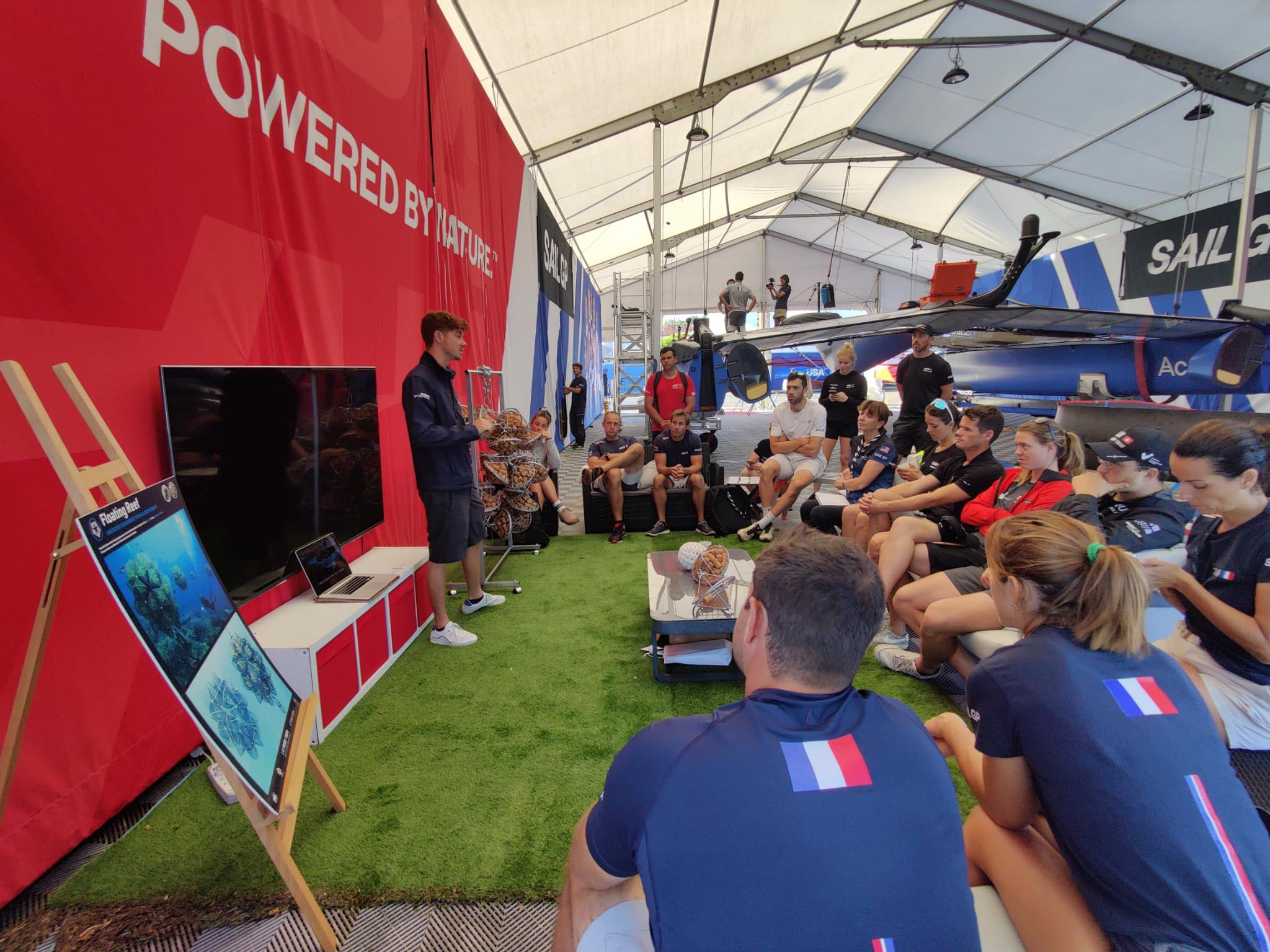 Le premier prototype Floating Reef est dévoilé en septembre 2022 à St-Tropez, face aux équipages internationaux du Sail GP (évènement partenaire du projet) et acteurs maritimes locaux.