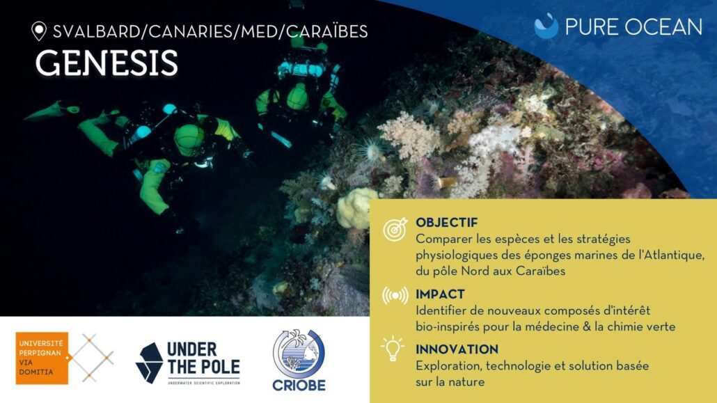 Dans le projet GENESIS, les équipes du laboratoire CRIOBE à Perpignan s’associent aux plongeurs scientifiques de l’association Under the Pole, basée à Concarneau. Et vont étudier ces forêts animales marines selon un transect Nord-Sud inédit : du Svalbard, aux Canaries, puis la Méditerranée, et enfin les Caraïbes. Grâce à des échantillons recueillis en plongées profondes, ils vont établir la première étude carte mondiale de l’ADN des éponges et leurs produits d’intérêt, et ainsi fournir des ressources inestimables pour la bioinspiration de demain.